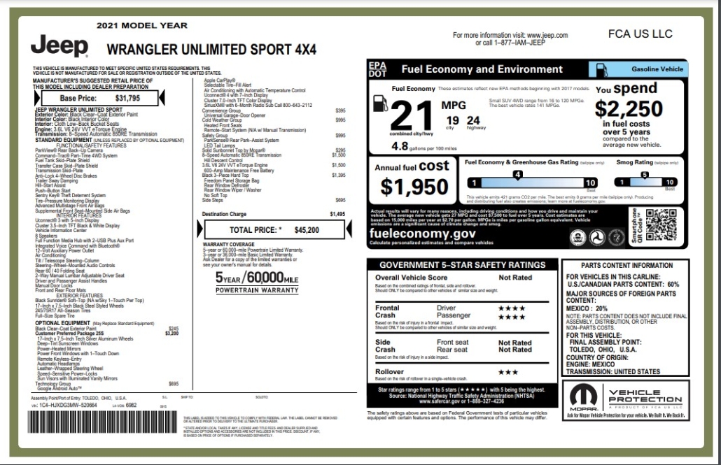 Sample Jeep Window Sticker Breakdown